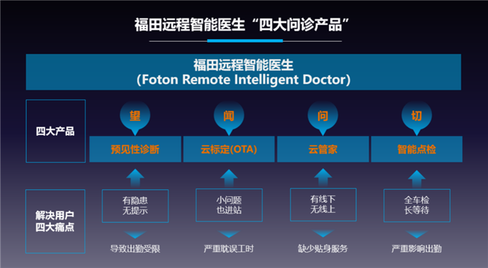 早在研发之初,福田汽车即锚定用户痛点,引进基于“场景+区域+工况”的产品开发和验证体系,制定完善的产品价值解决方案;营销层面,福田汽车积极推进互联网营销模式创新,为搭建数字化营销体系做出系统性规划和行动部署;服务层面,福田汽车创新发布预见性服务战略规划并推出福田“远程智能医生”,由传统服务向主动服务、智能服务、远程服务升级转型。