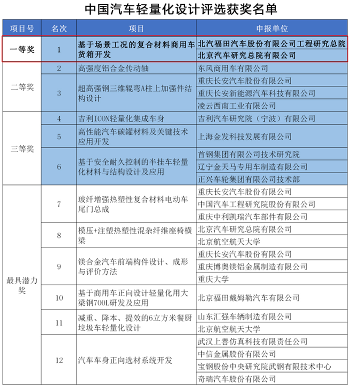 荣获一等奖!福田汽车轻量化货厢技术驱动用户价值再升级