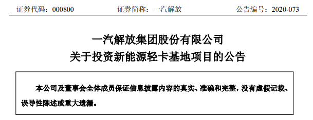 9月1日,一汽解放发布关于投资新能源轻卡基地项目的公告,拟投资99,800万元建设一汽解放新能源轻卡基地。该项目的主导产品为解放品牌的轻型系列载货汽车及部分中型载货车。建设内容包括总装线、驾驶室涂装线及相应的附属公用动力、库房、食堂等设施,项目达产后,可增加轻卡产能10万辆/年。