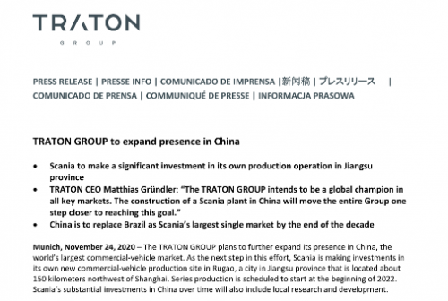 当地时间11月24日,大众汽车集团子公司、商用车制造商传拓集团(TRATON GROUP)宣布,旗下品牌斯堪尼亚将在江苏省如皋市新建商用车制造基地,以进一步扩大集团在中国的业务。如皋制造基地计划在2022年初开始量产。随着投资布局的深化,其研发中心也将落地中国。