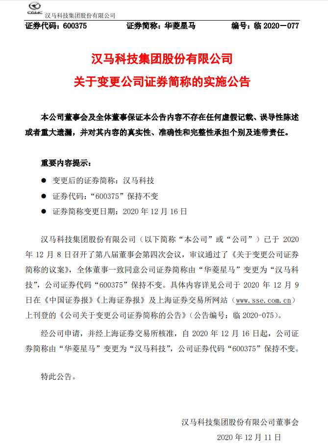 12月11日,汉马科技集团股份有限公司发布关于变更公司证券简称的实施公告,自2020年12月16日起,公司证券简称由“华菱星马”变更为“汉马科技”,公司证券代码“600375”保持不变。