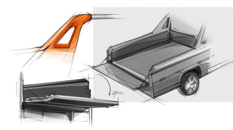 车身侧面,新车采用了双排五座的设计,并衔接了一个后货箱。同时,新车还配备了龙门架等配置,进一步提升该车的实用性。车身尺寸方面,新车长宽高分别为5105/1640/1810mm,车宽选装窄脚踏板为1700mm,选装宽脚踏板1815mm,轴距为3160mm;货箱栏板内尺寸为2000/1520/365mm。