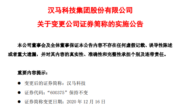 12月11日,汉马科技集团股份有限公司发布关于变更公司证券简称的实施公告,自2020年12月16日起,公司证券简称由“华菱星马”变更为“汉马科技”,公司证券代码“600375”保持不变。 [详细]