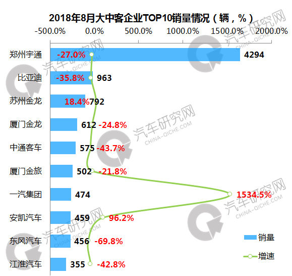 8月大中客企业中,郑州宇通遥遥领先,销量达到4294辆,同比则下滑27.0%;其他企业销量均不足1000辆,前十企业中,一汽集团增幅最高,达到1534.5%,销量达到474辆。
