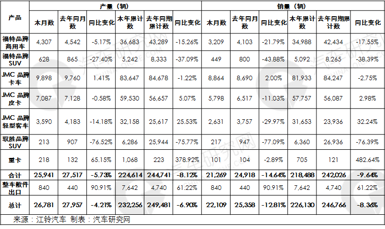 江铃汽车公布10月销量快报 前10月共销车22万辆