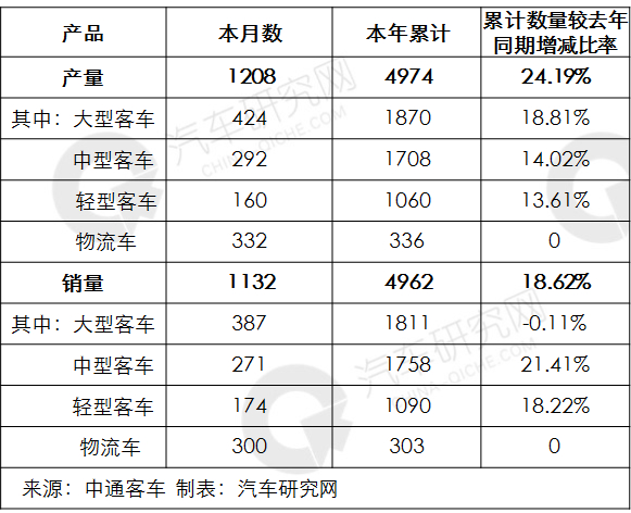 中通前7月中型客车累计销售3442辆 同比增长70.06%