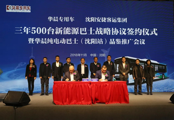 2018 年 11 月27日,华晨专用车与沈阳安捷客运集团新能源巴士战略协议签约仪式暨华晨纯电动巴士(沈阳站)品鉴推广会议在沈阳华晨专用车有限公司隆重举行。中国汽车工业协会副秘书长叶盛基、辽宁省先进装备制造业基地建设工程中心副主任韩革、沈北新区常务副区长卜世杰、辽宁省工信厅装备处副处长汪金华、沈阳市节能与新能源培训办公室副处长董立业、沈阳安捷客运集团董事长解卫,华晨汽车集团副总裁、华晨汽车投资(大连)有限公司党委书记 总裁刘学敏出席此次仪式,十余家银行及金融机构、沈阳及周边地区公交客运集团代表参会。现场,华晨专用车与安捷集团正式签订战略合作协议,未来三年内安捷集团将采购500辆华晨新能源巴士,为辽宁乃至东北地区纯电动公交车辆推广、应用起到示范作用。此举也是华晨专用车对《辽宁省污染防治攻坚战三年专项行动方案(2018-2020)》的积极响应。