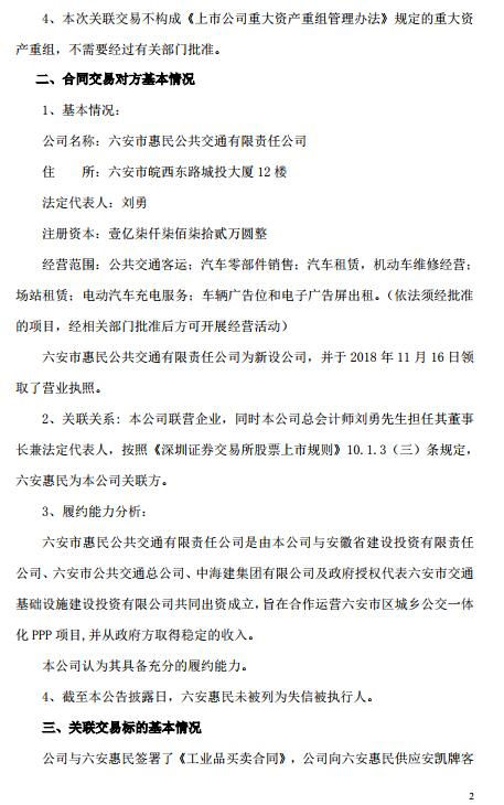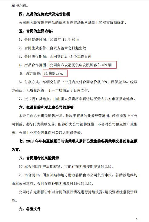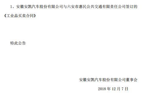 12月7日,安徽安凯汽车股份有限公司(以下简称“安凯客车”)发布关于签署重大合同暨关联交易的公告。安凯客车与六安惠民签署《工业品买卖合同》,向其供应安凯牌客车489辆,约定价格3.5亿元。六安惠民为公司下属联营企业,公司持有其45%股权,安徽省建设投资有限责任公司、六安市公共交通总公司、中海建集团有限公司、六安市交通基础设施建设投资有限公司分别持有其15%、10%、20%、10%股权。