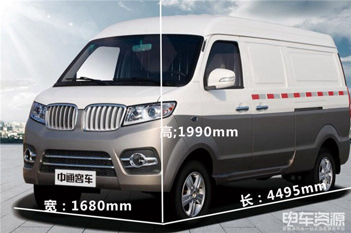 中通“轻舟”纯电动微面整车大小尺寸为4495×1680×1990mm,总质量为2200kg,轴距为2925mm,前后悬为600和910mm,前轮距为1425mm,后轮距为1435mm。