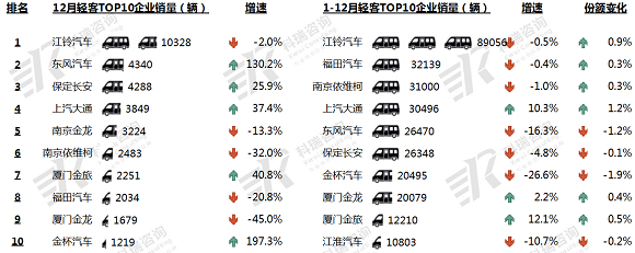 12月,TOP10轻客企业销量五升五降。江铃汽车依旧位居榜首,东风汽车和金杯汽车本月增长超100%。1-12月,TOP10客车企业销量三升七降。江铃汽车累计销售近9万辆,遥遥领先。东风汽车和金杯汽车同比均出现-15%以上的降幅。