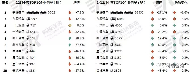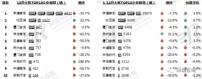 12月,TOP10大客企业销量二升八降。宇通客车依旧位居榜首,但同比下滑30.7%,实现增长的两家企业是比亚迪和中车时代,增速均超20%。1-12月,TOP10客车企业销量一升九降。宇通客车累计销售超2.5万辆,遥遥领先,且份额增加3.9个百分点,苏州金龙同比增长31.1%,成唯一增长企业。