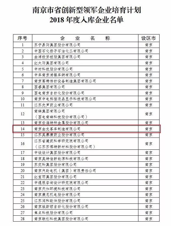 日前,江苏省科技厅公布了省创新型领军企业培育计划2018入库企业名单,南京市有28家企业入选,入选数量位列全省第一;其中,南京金龙榜上有名!