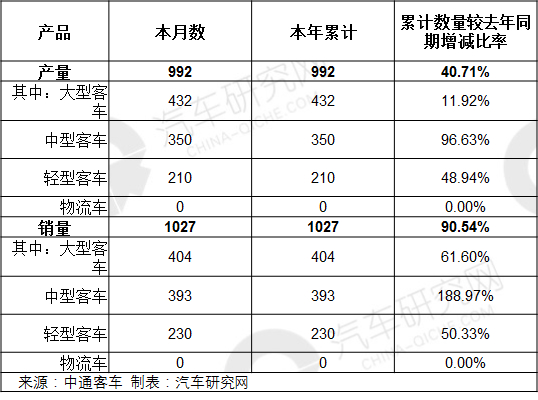 2月2日,中通客车发布1月份产销快报。数据显示,截至1月31日,累计生产客车为992辆,同比增长40.71%;累计销售1027辆,同比增长90.54%。
