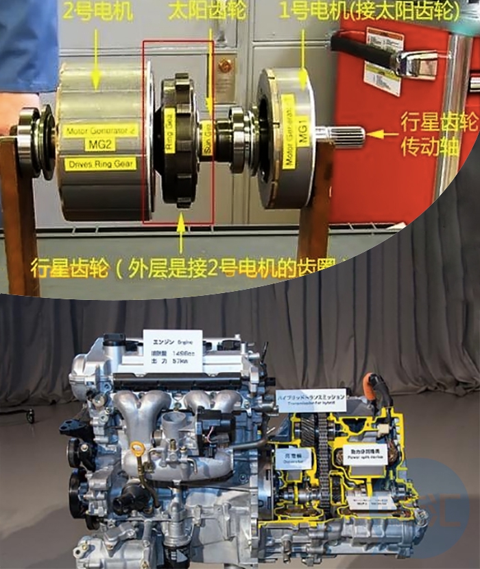 每一个不同车速,ECU计算出齿圈的转速有多快也就是发动机需要一个怎样的转速。然后再计算出1号电机应旋转多快,通过改变1号电机的转速,使发动机加速或减速,从而实现像无级变速箱那样平滑的变速而且无间断的动力输出。而2号电机主要的作用也是驱动车轮是与内齿齿圈相联的,内齿齿圈和2号电机一起通过减速齿轮和差速器来给车轮驱动车辆。