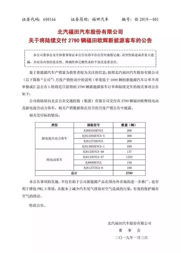 2019年1月,福田欧辉客车与北京公共交通控股(集团)有限公司(以下简称“北京公交”)签订了2790台新能源公交订单,创下了开年中国客车行业的第一笔新能源大单,打响了2019北京新能源客车市场“争夺战”。为了积极响应《北京市打赢蓝天保卫战三年行动计划》,促进新能源产品在国内外市场的进一步推广,有效的保护城市空气的清洁,福田欧辉客车2019年一开年便发起全面动员。