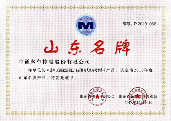 日前,山东省质量评价协会、山东省品牌建设促进会公布了2018年度山东名牌产品名单,并颁发荣誉证书。其中,中通客车四款车型被评为2018年度山东省名牌产品。