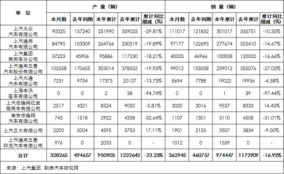 上汽集团11月销售车辆58.19万辆 累计同比下降13.33%