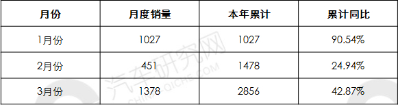 1-3月,中通客车累计销售各类客车2856辆,同比增长42.87%;其中,大型客车累计销售955辆,同比增长5.06%;中型客车累计销售1234辆,同比增长113.13%;轻型客车累计销售664辆,同比增长29.94%。