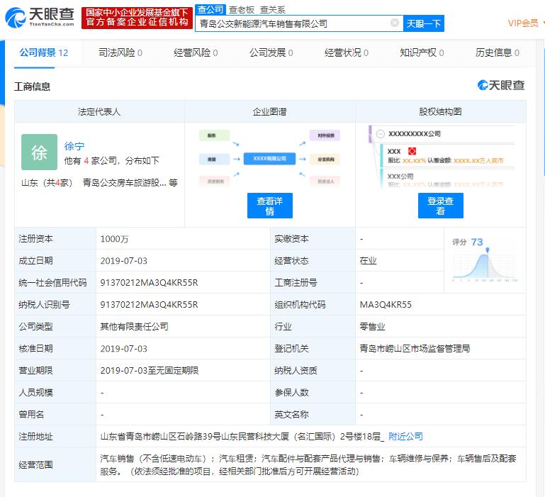 近日,青岛公交新能源汽车销售有限公司成立,注册资本1000万元,法定代表人为徐宁。公司的经营范围为“汽车销售(不含低速电动车);汽车租赁;汽车配件与配套产品代理与销售;车辆维修与保养;车辆售后及配套服务。”