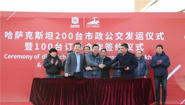 隆隆寒冬,中通客车厂区内却是一幅热火朝天的场面,厂区内各个市场的订单正在紧锣密鼓的生产。2019年12月11日,中通办公大楼前,中通客车出口哈萨克斯坦200台公交车交付仪式暨100台订单签约仪式隆重举行。