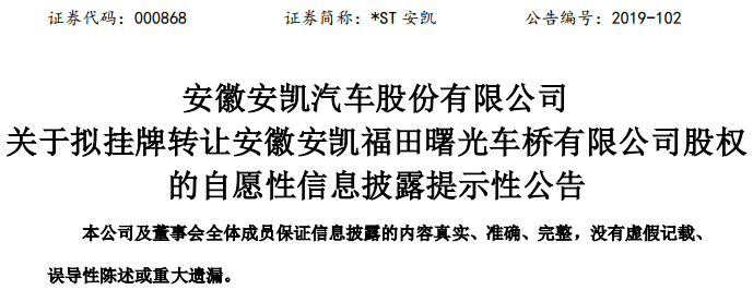 2019年12月18日,安凯客车发布公告,基于公司战略发展需要,进一步增强公司发展能力,公司拟将所持安徽安凯福田曙光车桥有限公司(以下简称“安凯车桥”)40%股权在安徽产权交易中心公开挂牌转让。