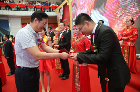 在一片喜庆祥和的气氛中,集团党委书记、总裁汤玉祥为新人们颁发结婚证书。掷地有声的誓言,情真意切的祝福,谆谆教导和嘱咐,让每个人的心中都充满了温情和感动。