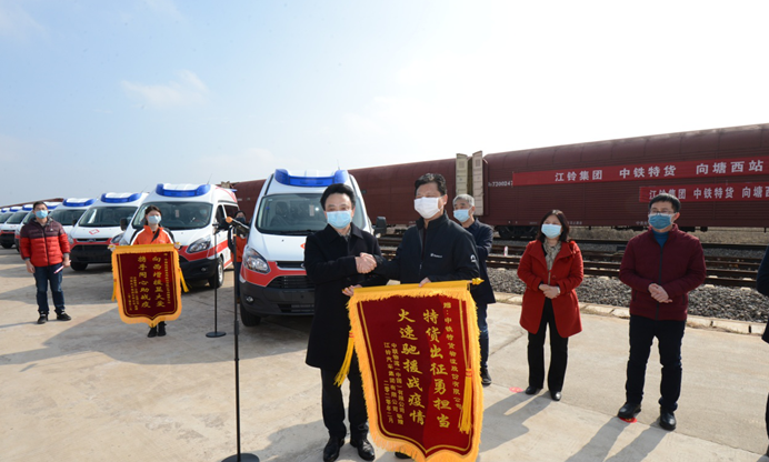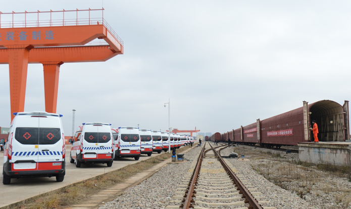 2月12日下午,装载67辆江铃负压救护车的专列在中铁特货紧急调配下,快速驶出南昌向塘铁路货场,全力向武汉进发。据了解,这批江铃负压救护车将于2月13日交付到湖北重点疫情地区各大医院,投入到新冠肺炎病人的救治中
