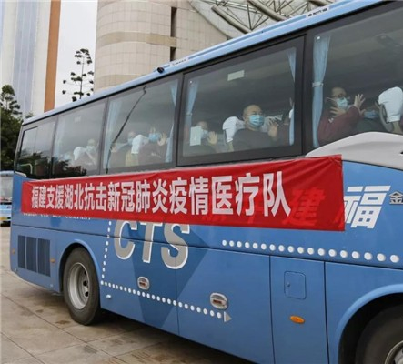 2020年2月15日,福建省再派出107名医护人员驰援武汉,前往当地方舱医院救治病患。当天,省委书记于伟国、省长唐登杰为医疗队出征壮行。在出征现场,金龙客车车队排成一行,全体出征的医护人员面向鲜红的标语,高声庄严宣誓:“宏扬敬佑生命、救死扶伤,敢于奉献、大爱无疆的职业精神,全力救治患者,勇于担当,不辱使命。”