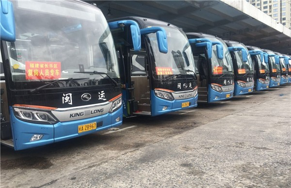 2020年2月14日和15日,福州市道运中心组织福建省汽车运输有限公司、福州三山公交旅游汽车有限公司等客运企业的60辆大型客车发往云南、重庆、四川、贵州等地接回复工企业人员。更喜人的是,福州市福建中旅客运有限公司等31家旅游包车企业的300辆客车已恢复市区周边的企业员工通勤接送服务。