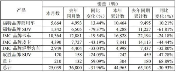 4月3日,江铃汽车股份有限公司发布2020年3月产销披露公告。公告显示,2020年3月,江铃产量21,696辆,同比下降35.99%;销售各类汽车25039辆,同比下降31.96%。2020年1-3月,累计产量42,539辆,同比下降30.66%;销量44,965辆,同比下降30.93%。