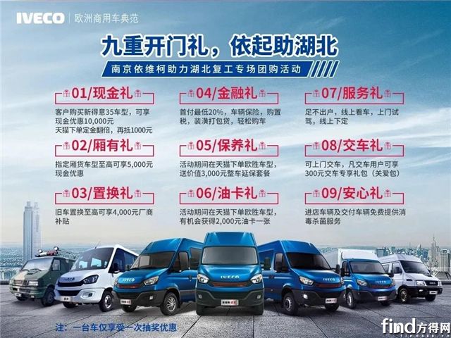 九重开门礼包括:购买新得意35车型,可享现金优惠10000元,天猫下单定金翻倍,再抵1000元;指定厢货车型至高可享5000元现金优惠;旧车置换至高至高可享4000元厂商补贴;首付最低20%,车辆保险、购置税、装潢打包贷,轻松购车;活动期间在天猫下单欧胜车型,送价值3000元整车延保套餐;活动期间在天猫下单欧胜车型,有机会获得2000元油卡一张等。