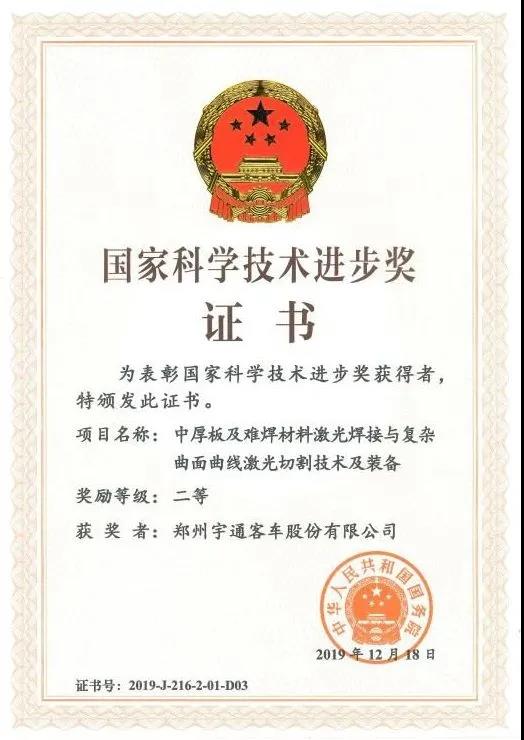日前,国务院正式颁发2019年国家科学技术进步奖证书,郑州宇通客车股份有限公司《中厚板及难焊材料激光焊接与复杂曲面曲线激光切割技术及装备》项目荣获国家科技进步二等奖。这是继宇通荣获2015年度国家科学技术进步二等奖后,时隔四年再次斩获国家级殊荣,成为行业唯一两次获得国家科技进步奖的企业。
