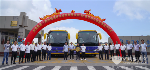 2020年7月9日,金旅客车15辆定制版豪华商务旅游车交付贵州盛通祥瑞旅游有限公司(以下简称“盛通祥瑞”),为当地高端旅游、团体接待等提供出行服务。盛通祥瑞总经理徐维一行到厦出席了交车仪式。