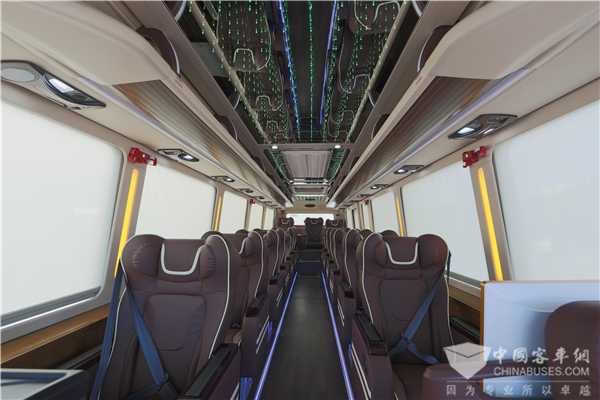据悉,该批车辆每一处细节精益求精,带头枕的豪华大商务座椅,椅面柔软,腿部和左右乘坐空间达到头等舱水平,高铁窗帘,软包顶内饰设计,可遥控的射灯及七彩LED氛围灯,数字化自动温控系统,USB充电接口,车载冰箱及饮水机等给每一位驾乘者从视觉、触觉、嗅觉和听觉等方面带来超越期待的享受。为满足旅途的娱乐需求,车辆还配置全套点播功能的多媒体娱乐播放系统,带了四个高品质的音箱及无线蓝牙麦克风等,让乘客的旅途充满欢歌笑语。