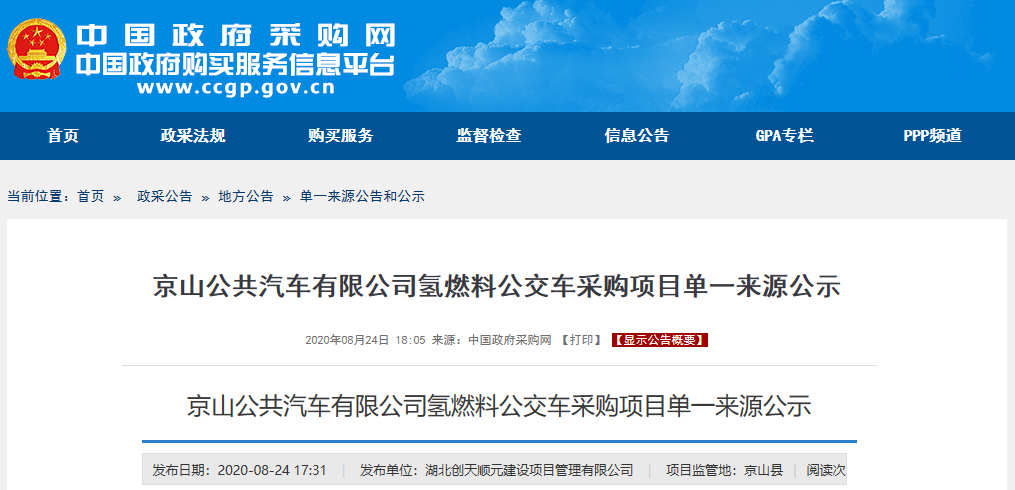 8月24日,湖北京山公共汽车有限公司氢燃料公交车采购项目单一来源公示,拟采购8.5米级氢燃料公交车30辆,预算金额为5970万元,即每车预算199万元。拟定唯一供应商为厦门金龙联合汽车工业有限公司。