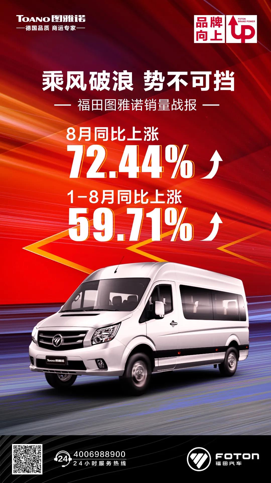 福田图雅诺8月销量同比上涨72.44%,1-8月累计销量同比上涨59.71%,用实力诠释用户对品质和品牌的高度认可!