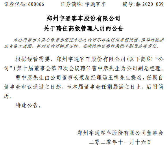 11月16日晚间,宇通客车发布关于聘任高级管理人员的公告,根据经营需要,宇通客车第十届董事会第四次会议聘任曹中彦为公司副总经理。曹中彦由公司董事长兼总经理汤玉祥提名,任期自董事会审议通过之日起,至本届董事会任期届满之日止。