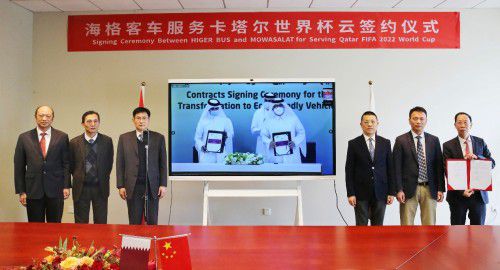 2020年11月30日,中国客车制造再次领舞世界,苏州金龙海格客车服务卡塔尔世界杯云签约仪式在卡塔尔首都多哈和中国苏州同步举行,海格客车1815辆大单成就中国大中型客车出口卡塔尔史上最大批量订单,这也是2020年中国大中型客车出口的最大批量订单。在国际疫情形势严峻,国内经济稳步恢复的当下,海格客车以漂亮的成绩单,为国家“一带一路”倡议再谱华章。卡塔尔国有运输公司CEO法赫德与海格客车总经理黄书平郑重签署协议,卡塔尔首相哈立德·阿勒萨尼,卡塔尔交通部部长贾西姆,中国驻卡塔尔大使周剑,使馆经商处参赞杨松,苏州工业园区管委会副主任陈东安,创元集团董事长刘春奇,苏州金龙董事长陈笃廉、副总经理邱远红、海外销售公司总经理姜海峰等领导共同见证了这一重要时刻。