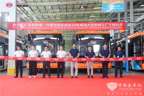 印度尼西亚首批30台比亚迪纯电动大巴于杭州工厂下线