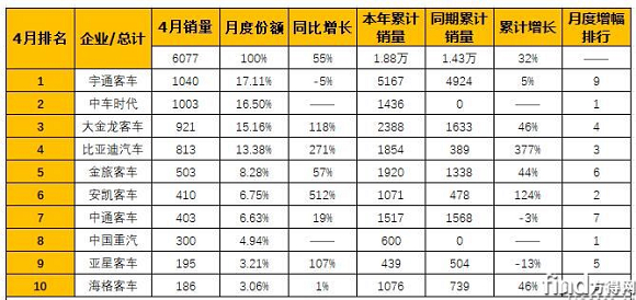 从市场份额来看,销量前十企业4月份合计份额达到95.01%,4月份销量前十企业中遭遇独降的宇通客车,本月的份额较3月份(18.70%)继续缩窄,这是3月份宇通份额大幅缩窄后的再次下降。4月份,大客销量前4企业份额非常接近,市场竞争愈发激烈了。