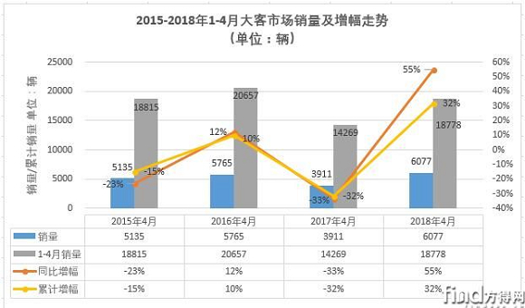 纵观近几年4月份大型客车销量及增幅走势图可见,2015-2018年的4月份及1-4月累计销量均呈现出增-降-增的走势,单月销量和累计销量低位均出现在2017年,当年4月大客销量仅有不到4000辆,1-4月累计销量则仅有1.43万辆。2018年4月份6077辆的成绩在近4年来看是表现最好的4月份,而2018年1-4月份的累计销量则和2015年基本持平,和近年高位的2016年还有约2000辆的差距。