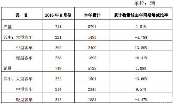 9月6日,安徽安凯汽车股份有限公司公布2016年8月份产销数据。公告显示,8月份安凯客车产销分别为741辆和749辆。1-8月,安凯客车累计销售各类客车5729辆,同比增长1.08%;累计生产各类客车5791辆,同比增长1.51%。