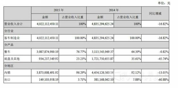 2015年,公司连续第六年实现客车销量过万,合计销售各类客车10,017辆,同比下降4.18%;受控参股子公司主要经营指标同比严重下滑的影响,合并销售收入40.22亿元,同比下降16.82%;得益于新能源客车销量的大幅增加,归属于母公司所有者的净利润4,023.66万元,同比增长70.95%。