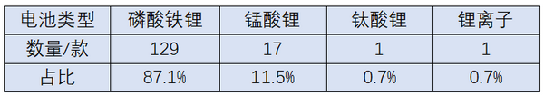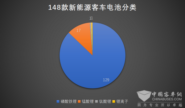 从电池类型看,在148款新能源客车产品中,磷酸铁锂电池依然是主流,其中129款搭载磷酸铁锂电池,占比87.1