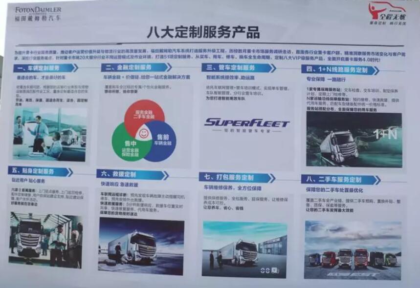 畅行无忧”,以包括车辆定制、金融定制、管车定制、1+N线路服务定制、贴身服务定制、救援定制、打包服务定制、二手车服务定制在内的8大定制产品,形成卡车定制服务闭环管理,覆盖20大行业。定制不是口号,福田戴姆勒汽车专门成立了客户定制中心,配有开发产品与管理的团队,在业务清晰化和智能IT化这两条腿的带动下对定制实现有效管控。