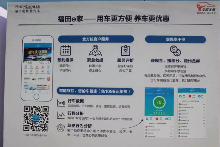 3717个“超级卡车司机之家”组成的超级大家庭就像一张细密的大网,以互惠互利的经济纽带将司机、服务站紧密联系在一起,解决维修及时性、质量及费用难题。此外,“司机之家”的卡友、客户可注册登录福田e家APP,共享平台资源。2018年,以福田e家平台为基础,围绕车辆预约/维保/救援的核心业务流程,福田戴姆勒汽车将打通故障诊断、费用预估、线上付款与评价等全业务流程的在线化,实现信息透明化,提高服务效率