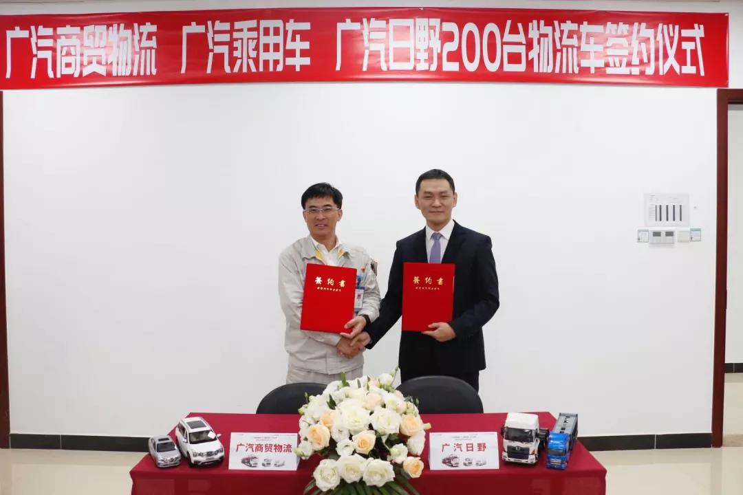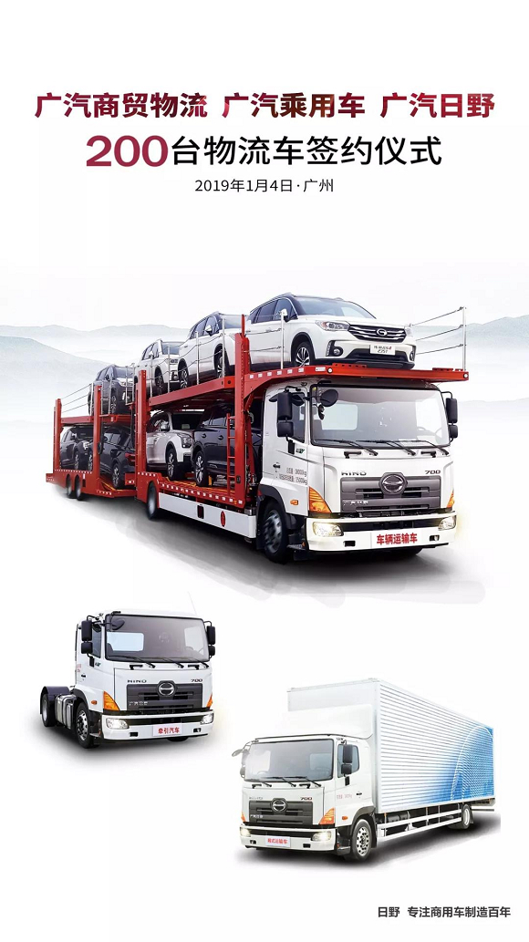 1月4日,广汽日野喜获新年第一单,于广汽传祺汽车销售有限公司发车中心举行“广汽商贸物流-广汽乘用车-广汽日野200台物流车签约仪式”。
