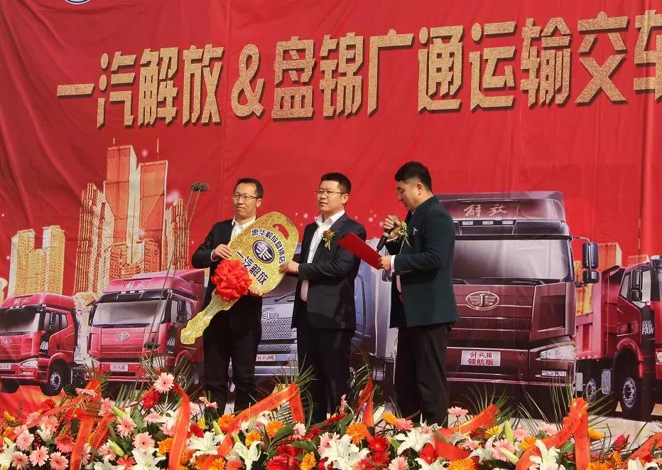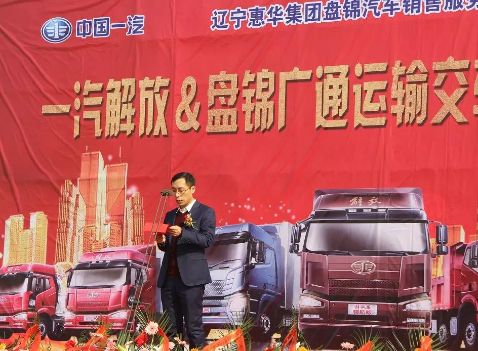 一汽解放辽宁商代处经理王鹏先生发表讲话,感谢盘锦广通运输对一汽解放的大力支持和信任。作为中国汽车工业摇篮,一汽解放始终秉承“不忘初心、牢记使命”的精神,坚持将客户需求当第一,不断进行产品研发和完善不足的工作态度,得到更多用户的认可和信赖。
