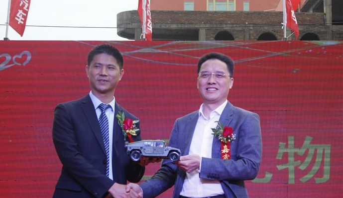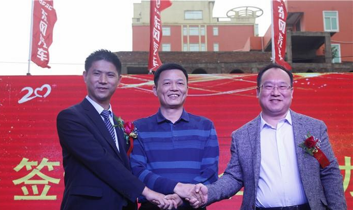 熊继海代表工程车事业部与晋江雅晟、泉州金泰龙签订300辆东风福瑞卡合作协议。泉州金泰龙向晋江雅晟授金钥匙。