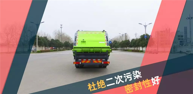 箱体与填装器之间具有液压自动锁紧装置和专用密封胶条,U型到顶设计,保证填料器与污水箱之间密封可靠,完全杜绝污水滴漏,减少环境污染;箱体设有密封式前门和后门,使整车完全密封,避免气味散发,有效提高周边居民生活舒适度。填装器盖完全遮盖住填装器投料口,消除转运过程车尾气流扰动造成垃圾尘屑飞扬的现象。